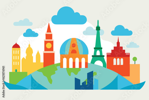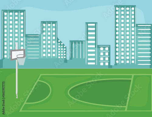 Vibrant city street scene with a basketball court showcasing urban life and recreational activities in a colorful graphic illustration