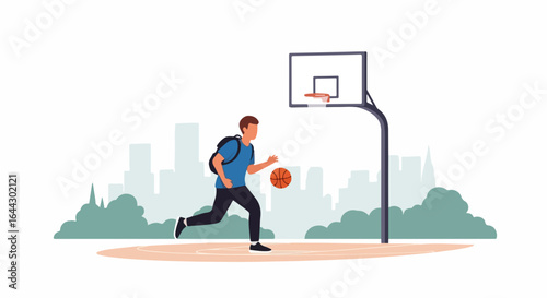 Young man with backpack dribbling basketball on outdoor court. Student playing basketball during break. Enjoyable basketball game in city park.