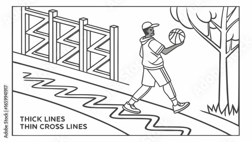 Young man in cap and hoodie walking with basketball on path next to fence and trees