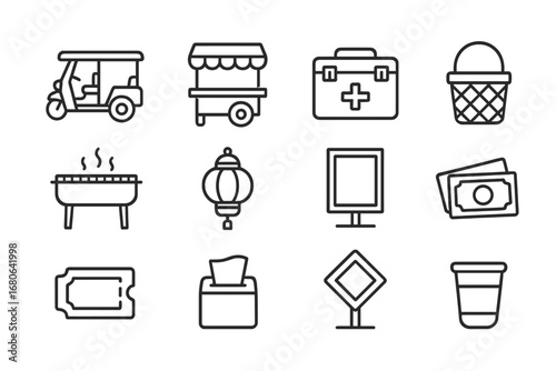 Tuk-Tuk Vendor Icons. Outline icon set of tuk-tuk street vendors: tuk-tuk, food stall, drink cooler, basket,