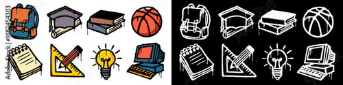 Grunge school graffiti icon set with backpack, graduation hat, book, basketball, notepad, ruler, pencil, light bulb, and computer. Hand drawn illustration in urban street art style
