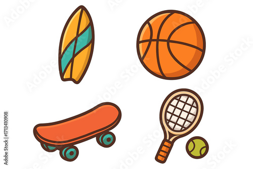 Vector sport icons set. Collection of cartoon surfboards, basketballs, skateboards, and tennis rackets. Summer activities and street sport equipment for a healthy lifestyle.