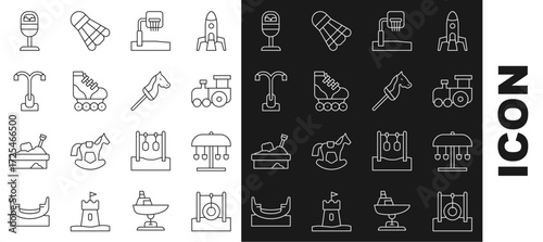 Set line Car tire hanging on rope, Attraction carousel, Toy train, Basketball backboard, Roller skate, Street light, Trash can and horse icon. Vector