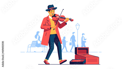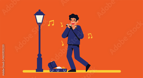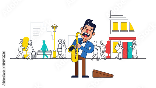 Street Musician: A cheerful musician brings a touch of melody and harmony to the urban streets. A stylized illustration