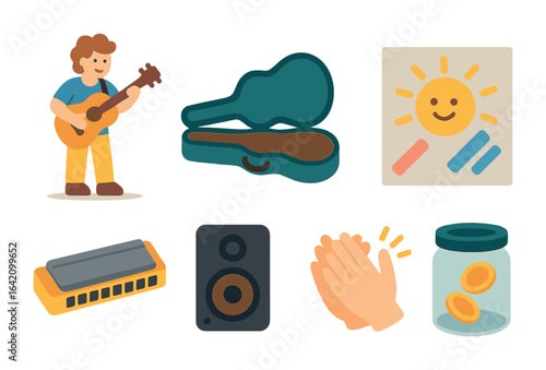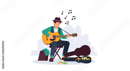 An illustration of a street musician playing an acoustic guitar in a city setting, with an open case for donations.
