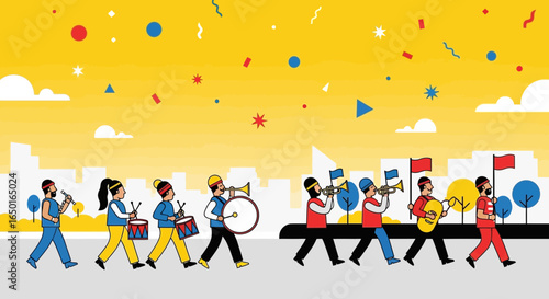 A graphic illustration of a marching band drummer playing during a vibrant city parade.