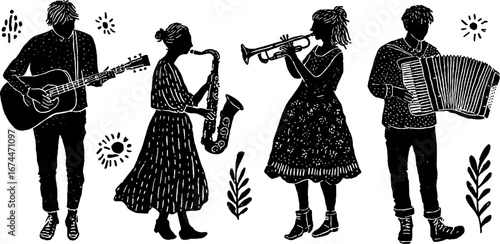 Linocut street music collection with guitar, saxophone, violin, and saxophone for artistic design