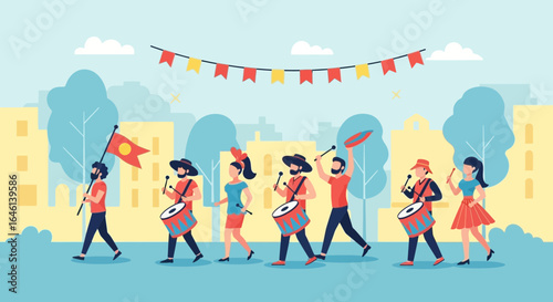 Joyful Musical Street Parade Celebration With Festive Decorations And Cityscape
