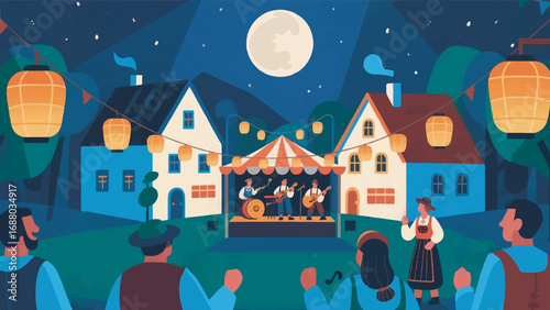 Vibrant carnival celebration in a colorful urban setting with dancers and musicians at night