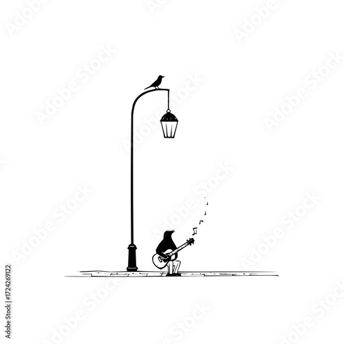 Silhouette of a bird playing guitar under a lamppost with another bird on top in black and white