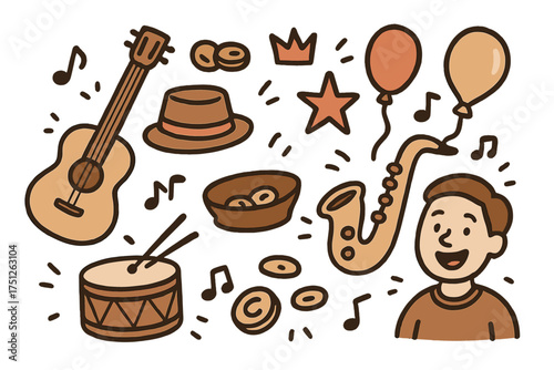 Street Musician Icons. Street musicians doodle icon set: hand drawn icons of guitar, hat, coins, crown, star, balloon, saxophone,