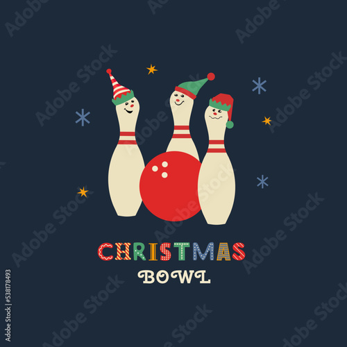 Christmas holiday bowling fancy vector icon. Bowling ball funny pins in Elf hats cartoon design element. Bowling club x-mas holidays invitation template. Christmas party event background illustration
