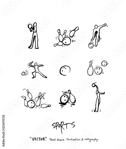 An illustration of a 'bowling' equipment object, one of the types of sports. Bowling ball and bowling pins.