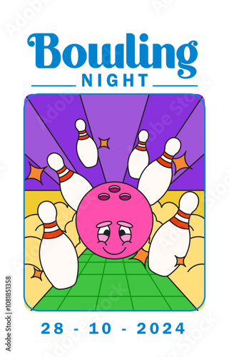 Bowling Night Event Poster Featuring a Cheerful Pink Bowling Ball and Striking Pins Cartoon Retro Vintage Illustration