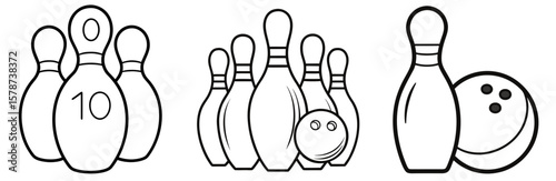 Monochrome flat icons, bowling skittles with ball. Vector illustration, isolated on white background. Sport games. Simple shape for design logo, emblem, symbol, sign, badge, label, stamp.