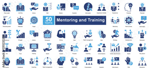 Coaching icon set collection. Icon pack contains leadership, skill, mentor, guide, train, teach, support, advise, lead, grow, inspire, goal, focus, plan, motivate, action