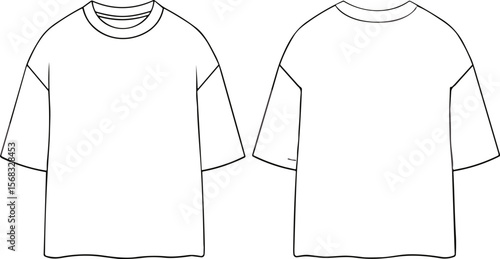 Oversized casual t-shirt cad drawing flat vector, men fashion technical sketch, drop shoulder crew neck top template front back view