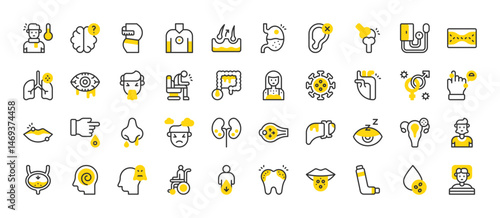 Set of Diseases vector stroke icons. such as Cartilage, Hallucination, Std, Hair Loss, Dehydration, Cervical, Drowsiness, Glaucoma, Paralysis, Alzheimer, Depression, Anemia, Kidney Stone illustration.