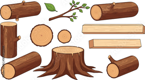 Vector illustration of wood logs, tree stump, branches, planks, and slices for forestry, woodworking, nature, biology, and lumber design
