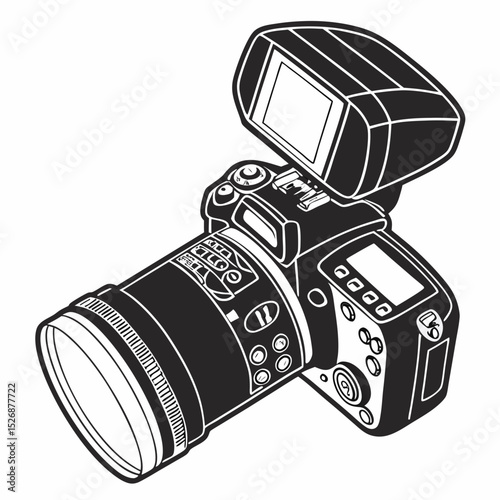 Detailed illustration of a digital slr camera in a striking black and white silhouette