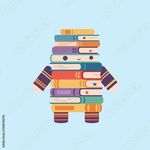 Vector illustration of illustration of isometric illustration of a small robot studying with books, graduation cap, and computer screen, symbolizing artificial intelligence education and learning