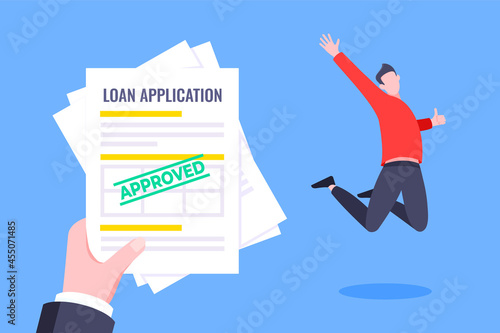 Hand holds loan approval application paper sheets document. Mortgage or credit form with stamp approved and happy person jumping behind flat style design vector illustration.