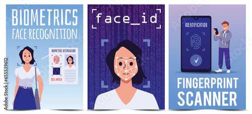 Set of vector posters of Biometrics recognition system, facial scanning, fingerprint scanner for authorization concept