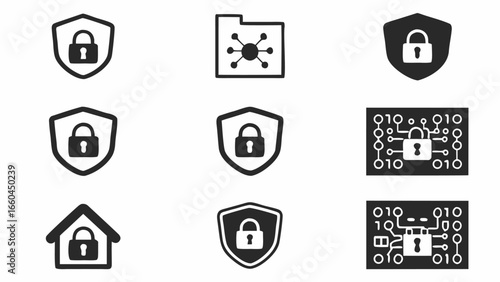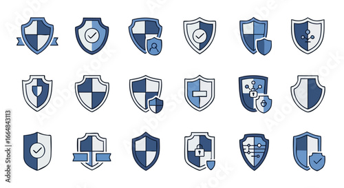 Vector art of collection of security shield and padlock icons in various styles, perfect for digital safety and privacy