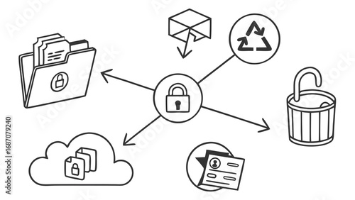 Collection of security icons including locks shields and devices representing data protection and user privacy