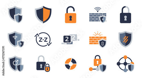 Secure digital icons collection featuring cybersecurity, data protection, and network security elements for modern business and technology applications
