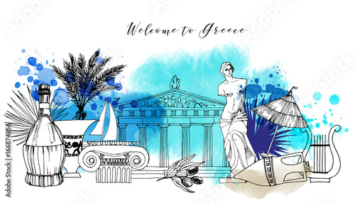 Vector illustration set of hand drawn doodle style landmarks, sights, symbols of Greece. Tourism, travel.