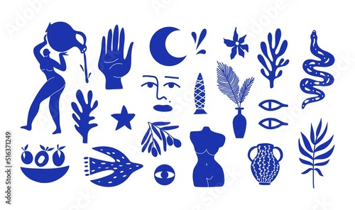Modern set of Greek statues, columns, celestial elements, vases, flowers. Ancient Greek goddess, antique statue, sculpture. Vector isolated on white background. Renaissance. Hand drawn line art