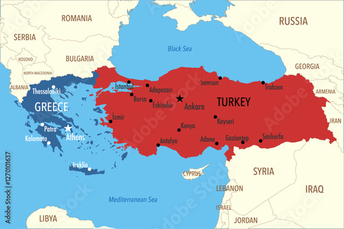 Greece and Turkey Flags Crossed And Waving Flat Style. Official Proportion. Correct Colors.