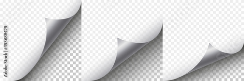 3d realistic vector illustration. Curled paper page corners on transparent background with shadow