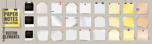 Realistic paper notes collection. Sticky memo sheets and torn notepad pages with clips, pins and tape. Polaroid frame. Office stationery reminder set on transparent background
