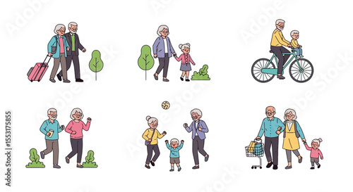 A heartwarming illustration of grandparents spending quality time with their grandkids outdoors