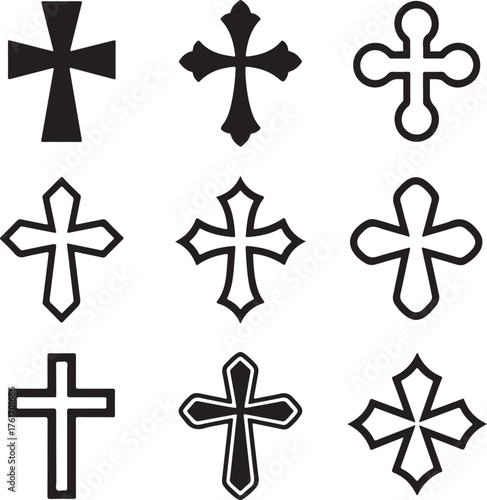 Christian cross icon set. Silhouette collection of religious symbols. Vector graphic crucifix illustration. Faith, spirituality, and Easter concept. God, Jesus, church element.