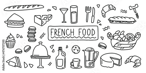 Travel to France doodle set icons vector. Simple hand drawing sketch buildings and national objects.