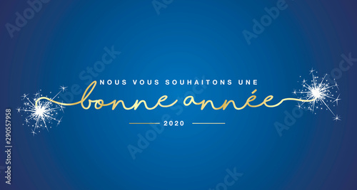 We wish you a Happy New Year 2025 French language unique modern ribbon calligraphic text with sparkler firework gold blue color background