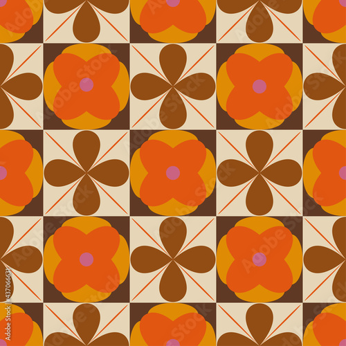 Retro floral seamless pattern illustration set. Vintage style hippie flower background design collection. Geometric checkered wallpaper print, spring season nature backdrop texture with daisy flowers.