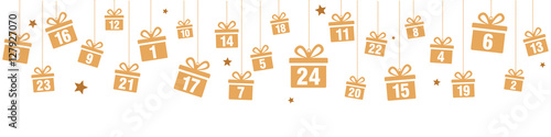 Christmas advent calendar.New Year. Paper sheets with number of calendar days of December, confetti, decorations on a white.