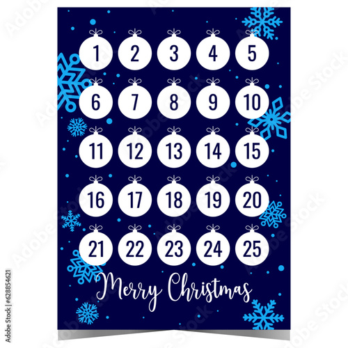 Christmas advent calendar countdown printable numbered poster with xmas elements and symbols, vector illustration