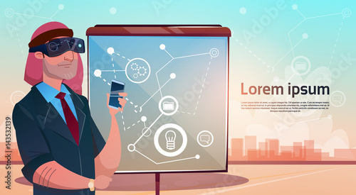 Rich Arab Businessman Wear Digital Glasses Virtual Presentation Flip Chart Oil Extraction Business Success Flat Vector Illustration
