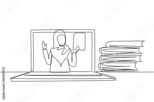 Single continuous line drawing Arabian woman giving presentation to camera doing webinar. Blogging, online training and conferences concept. Camera on tripod. One line draw design vector illustration