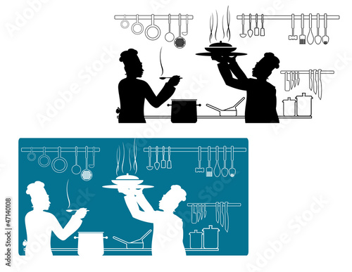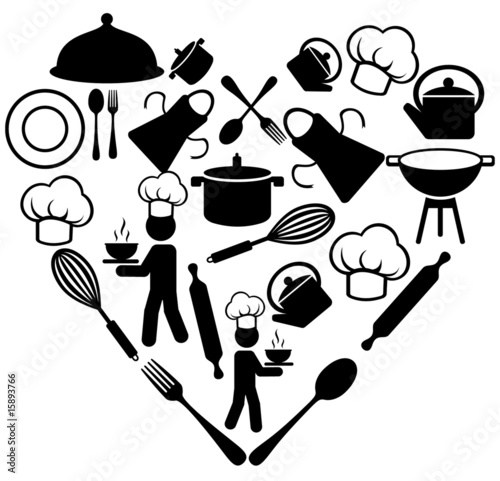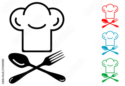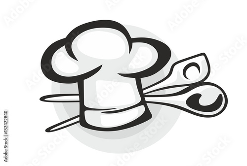 A minimalist chefs silhouette with lines forming a frying pan on one side and a spoon on the other, balanced symmetrically