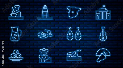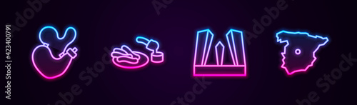 Set line Spanish wineskin, Churros and chocolate, Gate of Europe and Map Spain. Glowing neon icon. Vector