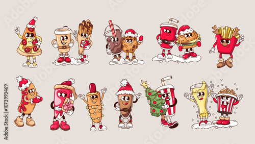 Groovy Christmas fast food cartoon characters set. Funny retro pizza and cake, hot dog and cookie, churros, beer. Christmas mascot, cartoon trippy emoji collection of 70s 80s style vector illustration