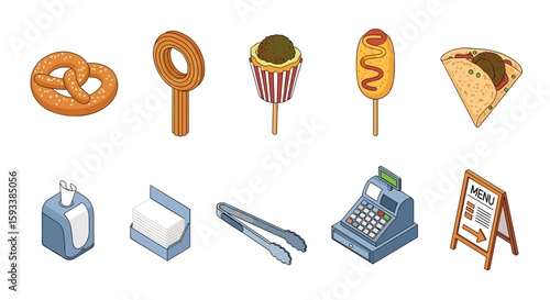Isometric view of food items including pretzel churro corn dog taco and restaurant equipment setup