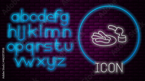 Glowing neon line Churros and chocolate icon isolated on brick wall background. Traditional national Spain dessert, European street food. Neon light alphabet. Vector