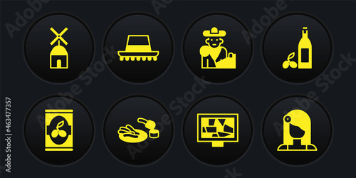 Set Olives in can, Bottle of olive oil, Churros and chocolate, Picture art, Bullfight, matador, Spanish hat, woman and Windmill icon. Vector